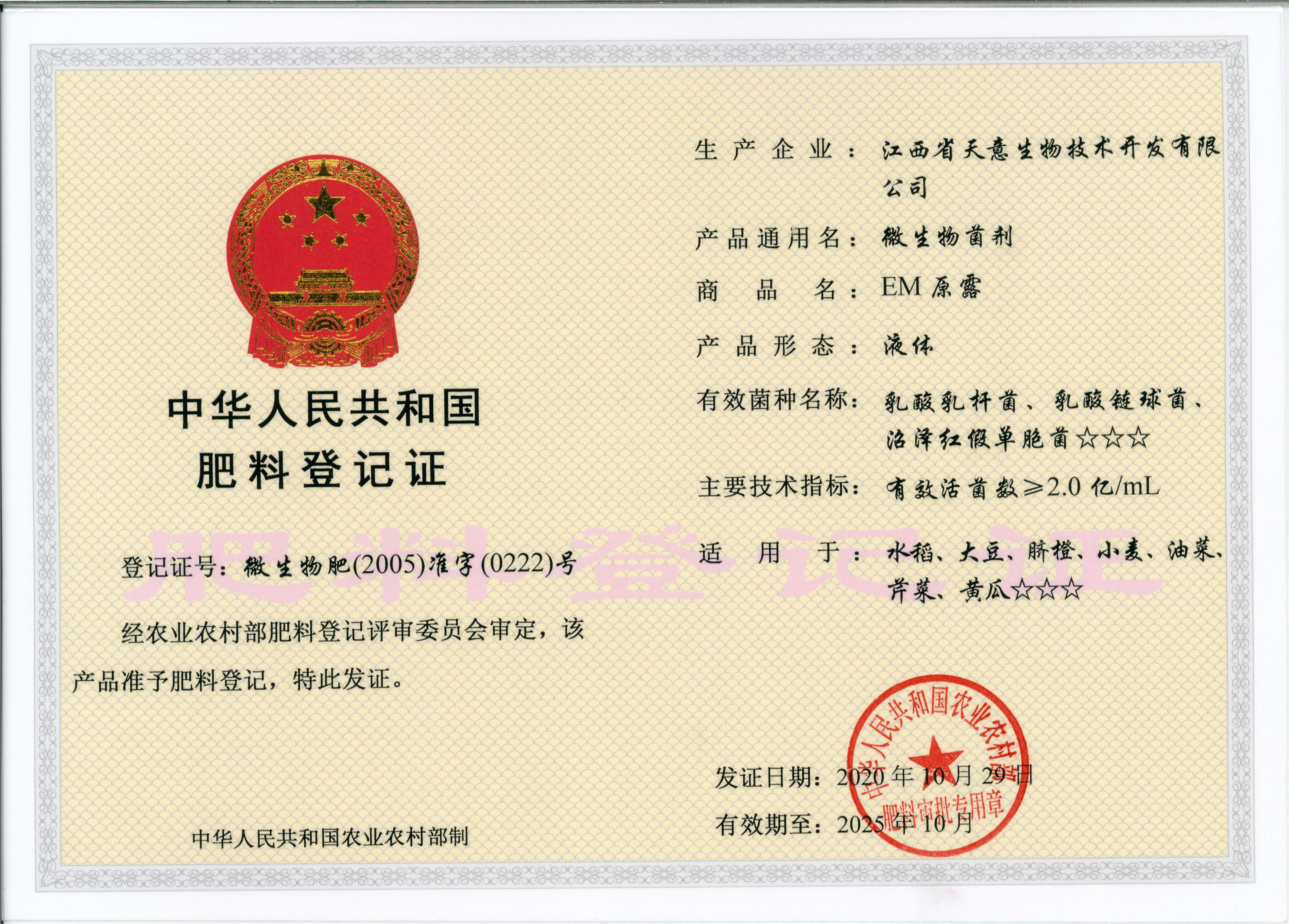 喜訊:江西天意生物產品“EM原露”通過“有機農業生產資料評估證明”認證 2023年4月6日,江西天意生物集團收到了來自國內權威第三方認證機構南京國環有機產品認證中心出具的“有機農業生產資料評估證明”。